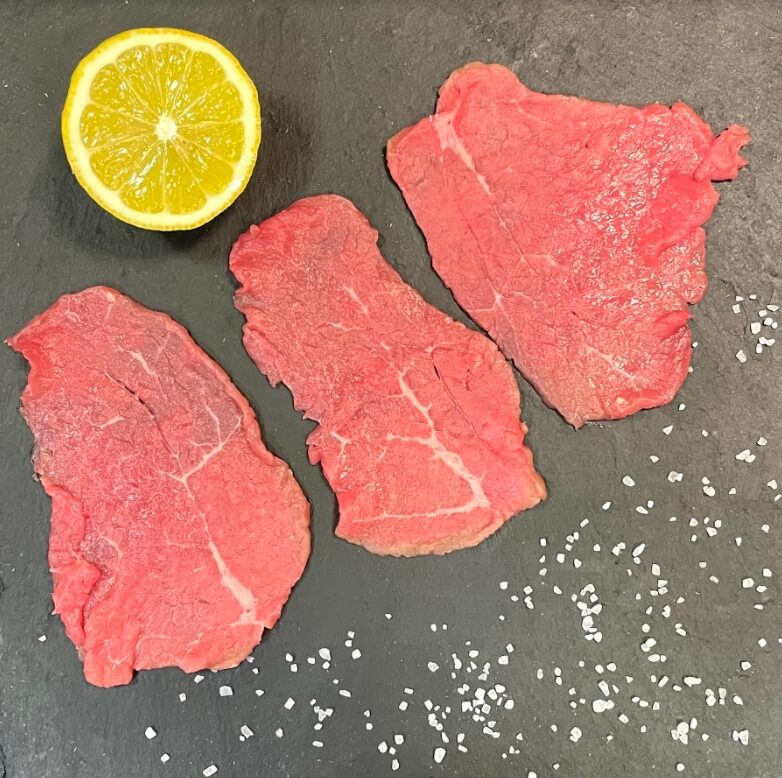Carpaccio. Viene preparato con girello di coscia affettato sottile come il salume.