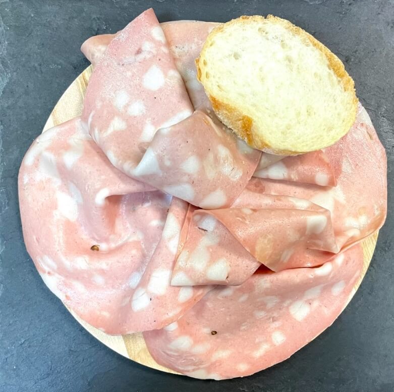 Mortadella 4 Castelli. Viene affettata direttamente al momento della preparazione dell’ ordine.