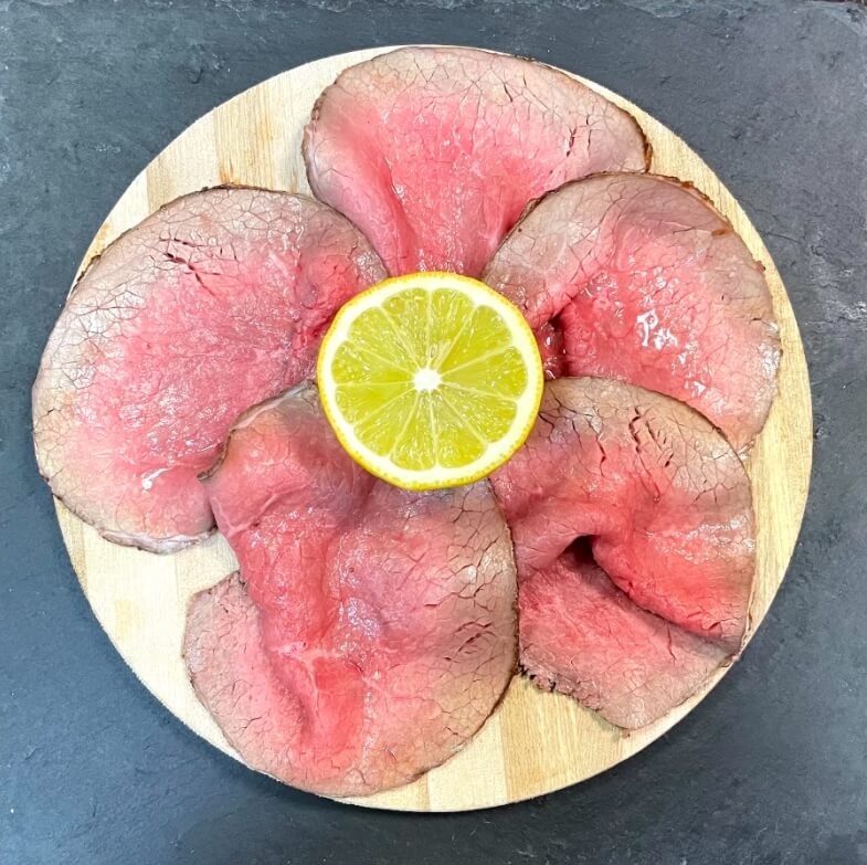 Roast-beef preparato da noi con girello di coscia. Viene affettato direttamente al momento della preparazione dell’ordine.